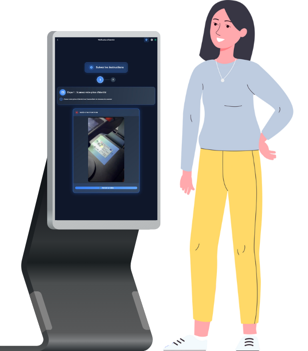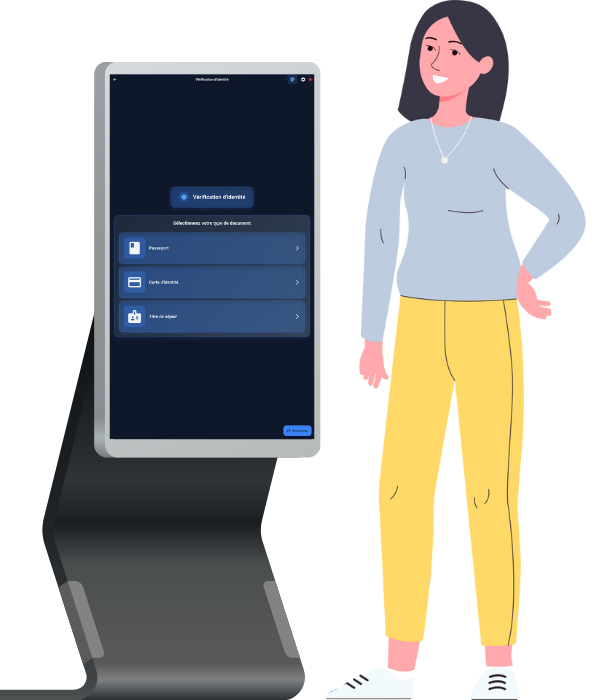 La borne utilise un terminal Sunmi V2 intégré pour scanner automatiquement la pièce d’identité (passeport, carte d’identité, permis selon les pays).