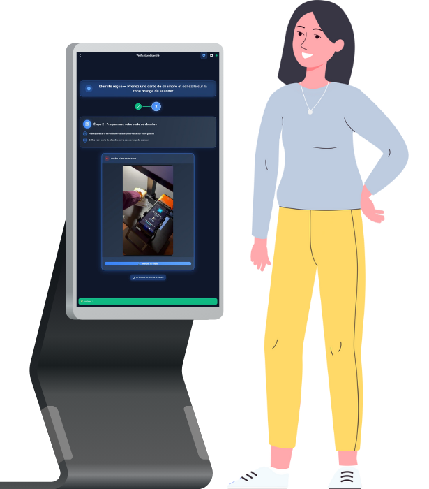 La borne permet aux clients de réaliser leurs démarches en totale autonomie : Identification du client, Vérification des informations, Paiement et Check-out rapide avec génération de facture.
