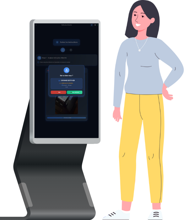 Le client commence en scannant sa pièce d’identité directement sur la borne grâce au terminal Sunmi V2. La borne extrait automatiquement les informations essentielles (nom, prénom, date de naissance, numéro de document…).