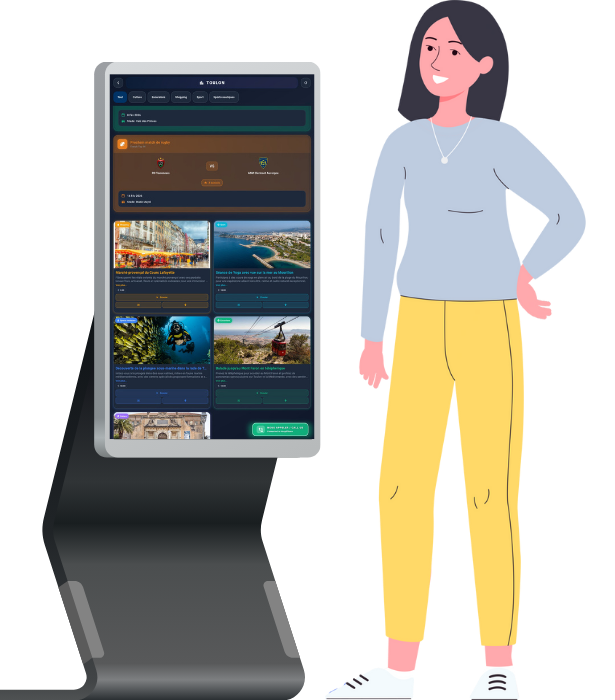 Chaque borne est entièrement personnalisable : Intégration du logo, Couleurs et identité visuelle adaptables, Possibilité d’afficher des promotions, annonces locales, etc.